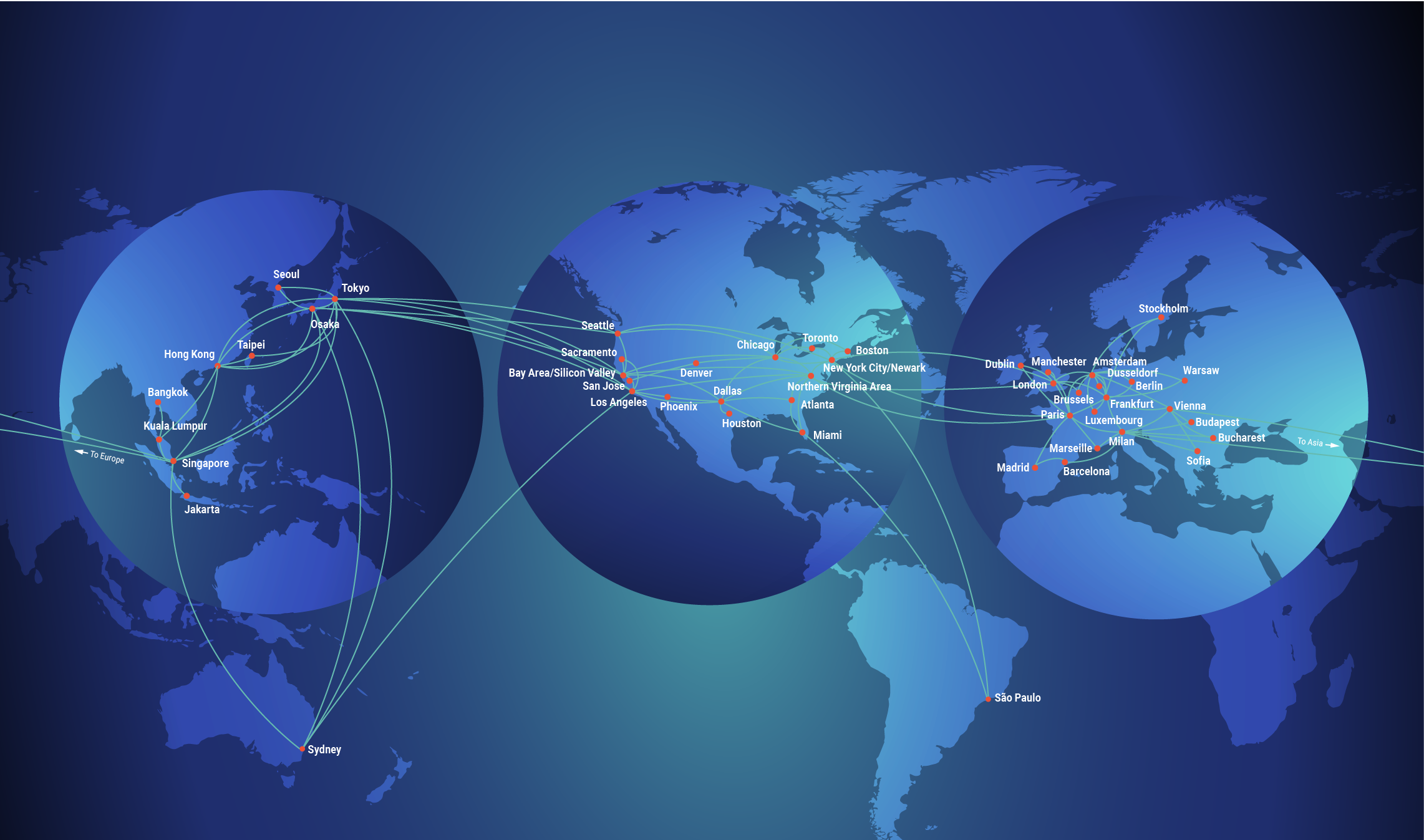 For some ISPs, data has to travel across multiple ASNs to arrive at its destination, which can mean up to 20 hops. We can do it in fewer than five. With strategically located exchange points around the world, you can get to ANY access point on our global network in fewer than five hops. That means your data travels smoothly around the world (and back), and with fewer delays.