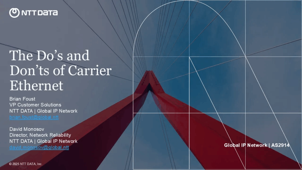 Ethernet services are ideal for businesses and organisations that are looking for cost-effective, reliable and secure layer 2 connectivity. In this webinar Brian Foust and David Monosov explore the concept of Ethernet services, including an overview of the technologies available today, and its features and advantages. Most importantly, they provide some very helpful do’s and don’ts and offer examples of practical applications of Carrier Ethernet that service providers and enterprises can implement in their own networks.