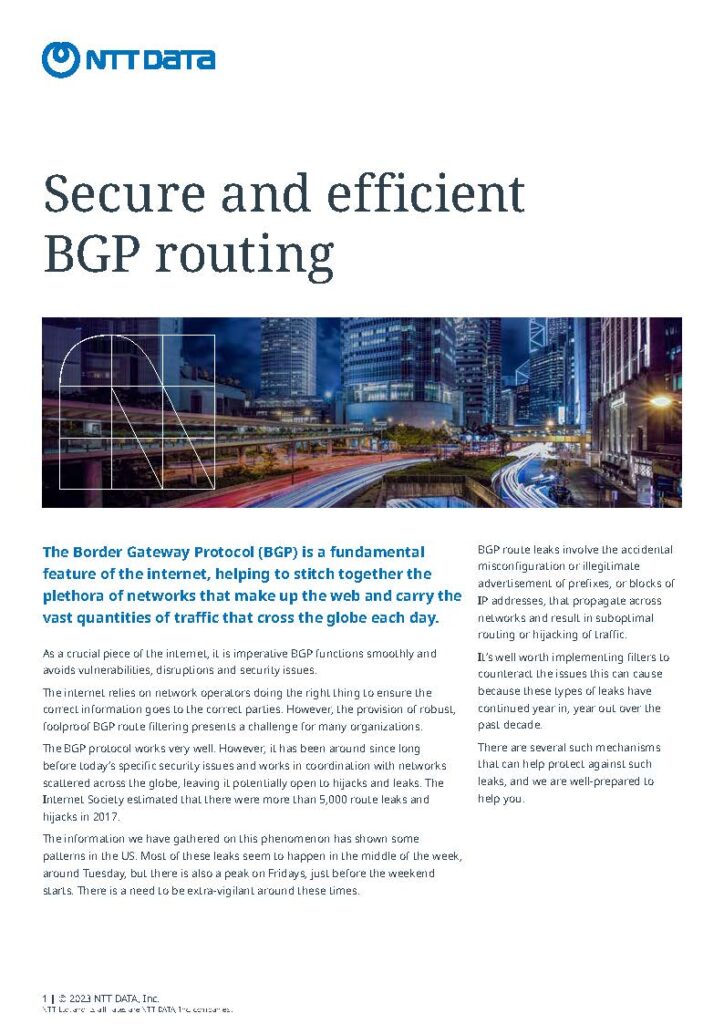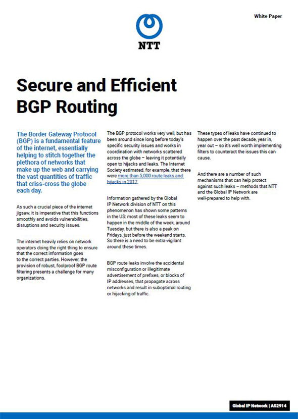 NTT DATA is a global leader in all Internet-related businesses. Our Tier 1 Global IP Network, consistently ranked among the top networks worldwide, spans the Americas, Europe, Asia and Oceania, providing a premier environment for content, data and video transport through a single Autonomous System Number (AS2914).
