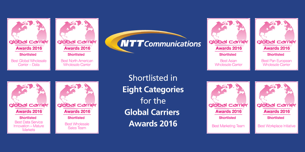 NTT Communications has been shortlisted in eight categories for the Global Carrier Awards 2016, including Best Global Wholesale Carrier (data), Best North American Wholesale Carrier, Best Pan European Wholesale Carrier and Best Asian Wholesale Carrier.